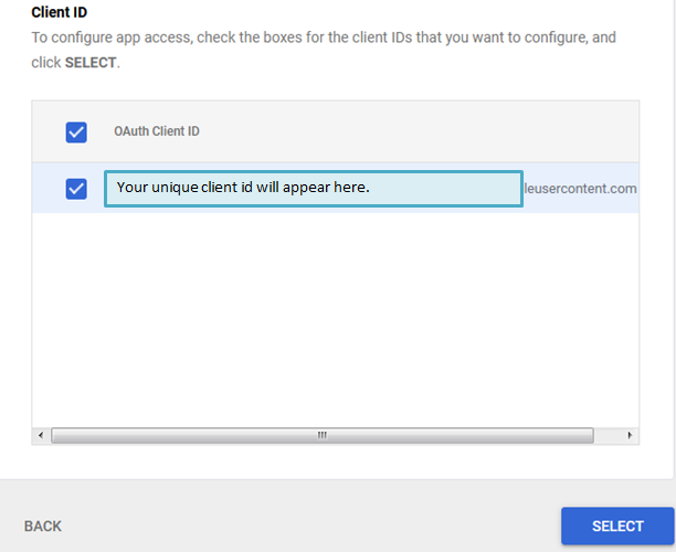 - Check the box next to the Client ID and then the Select button in the lower right corner.